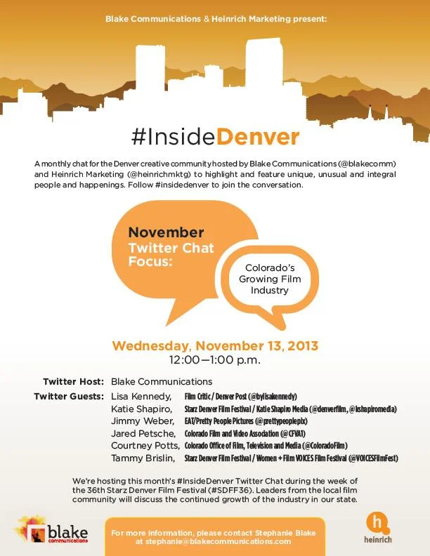 /On Wednesday I will be participating with the #InsideDenver twitter chat. We will be discussing all things related to the Starz Denver Film Festival as well as making movies in Colorado, in general. It should be a fun event. While you have to be in Denver to attend the screenings of EAT on November 15th and 16th, everyone with Twitter will be able to participate this Wednesday. So click on the image above and get all the details. Should be a good time!